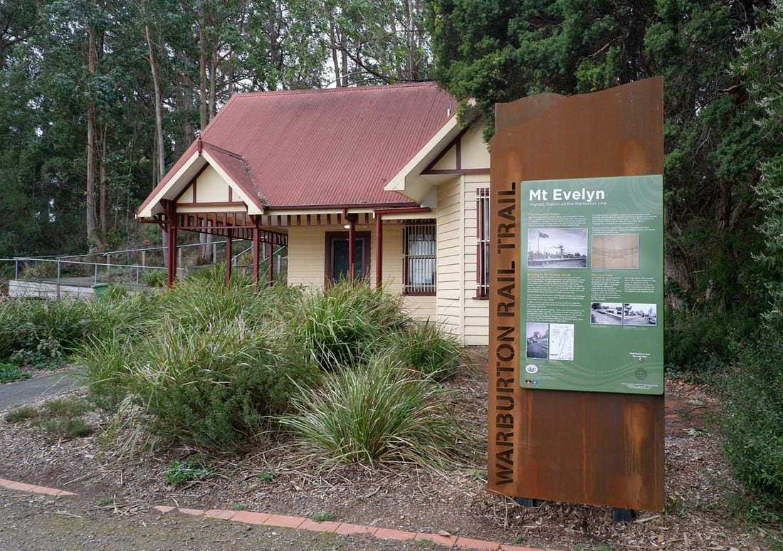 Mt Evelyn Station site Wray Cres Mt Evelyn VIC 3796 Wray Cres, Mt EvelynUnveiling of Station sign at Mt Evelyn (with button to push to hear actual train), followed by showing of Last Train to Warburton in Community Room adjacent. Organised by Mt Evelyn History Group Inc.